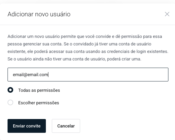 - Escolher permissões — você define manualmente o que esse usuário pode visualizar ou gerenciar