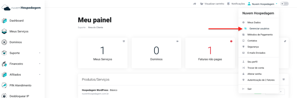 Acesse a Central de Cliente e faça login com seu e-mail e senha. No canto superior direito, clique no seu nome ou nome da empresa e selecione Gerenciar Usuários.