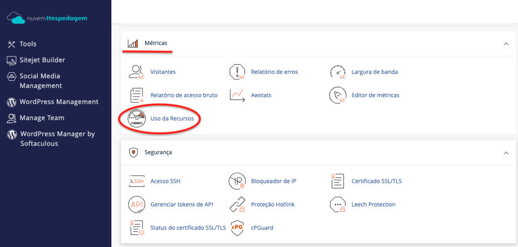 Caso não saiba acessar o cPanel, use o esse tutorial aqui. - Na barra de pesquisa no topo da página, digite Uso de Recursos.